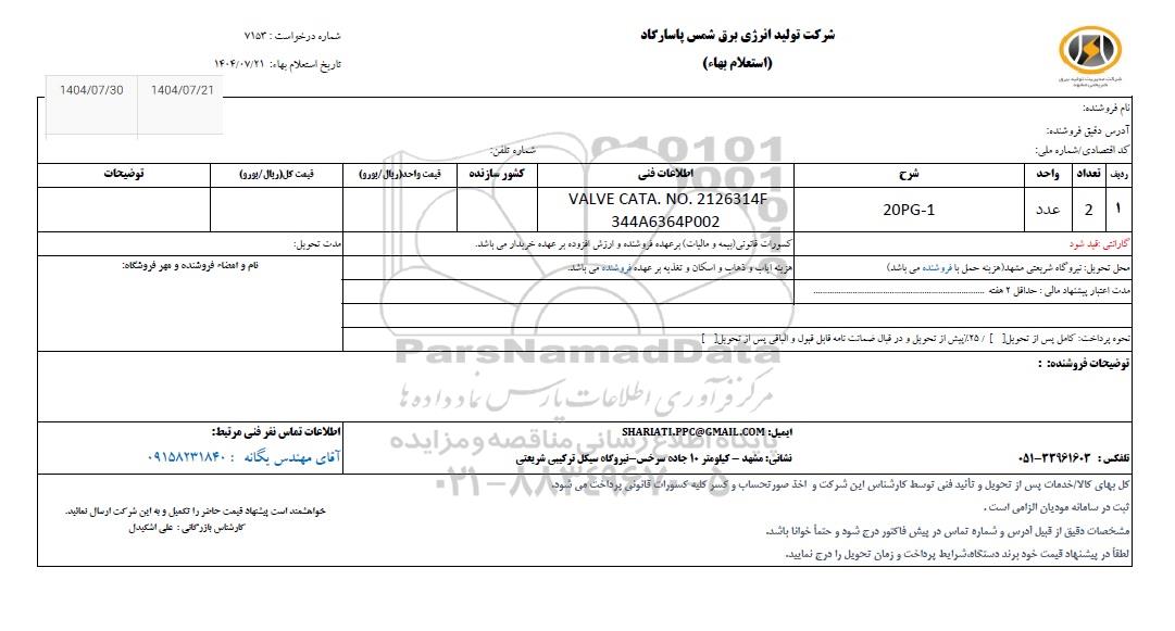 استعلام بها و موضوع استعلام استعلام 20PG-1 به اطلاع کلیه شرکتها و افراد متخصص واجد شرایط میرساند، آگهی گذار در نظر دارد از طریق استعلام بها، نسبت به انتخاب و دریافت پیشنهادات اقدام نماید. این استعلام با کد آگهی ثبت شده در سامانه خبرگزاری پارس نماد : 9699211 منتشر شده است. مشخصات استعلام : تاریخ شروع استعلام: 1404/07/22 آخرین مهلت ارسال پیشنهاد قیمت : 1404/07/30 و محل اجرای پروژه : استان خراسان رضوی میباشد. استعلام قیمت مورد درخواست : استعلام 20PG-1 با دستهبندیهای تخصصی و گروه های مرتبط : شیرآلات, نیروگاه, تجهیزات برق و الکترونیک, استعلام اطلاع رسانی میگردد.