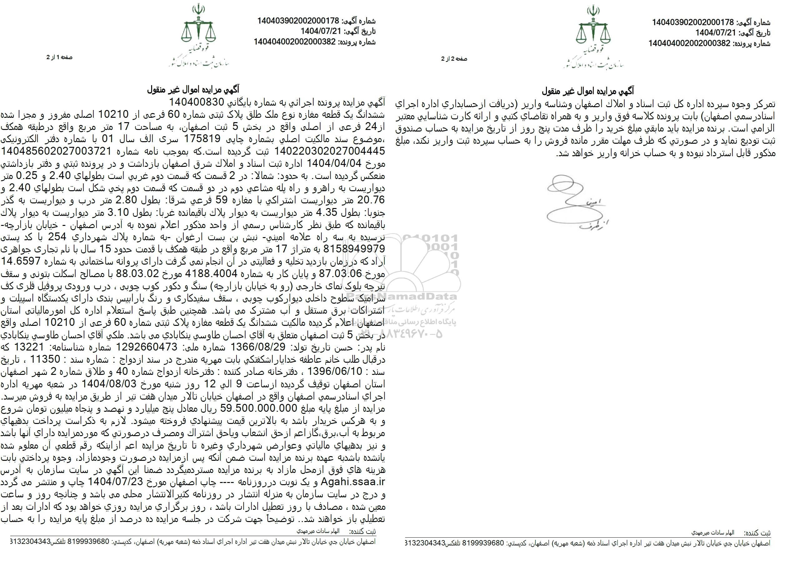 آگهی مزایده پرونده اجرائی به شماره بایگانی 140400830 ششدانگ یک قطعه مغازه نوع ملک طلق پلاک ثبتی شماره 60 فرعی از 10210 اصلی مفرور و مجرا شده از 24 فرعی از اصلی واقع در بخش 5 ثبت اصفهان به مساحت 17 متر مربع واقع در طبقه همکف موضوع سند مالكيت اصلي بشماره چایی 175819 سری الف سال 01 با شماره دفتر الکترونیکی 140220302027004445 ثبت گردیده است. که بموجب نامه شماره 140485602027003721 مورخ 1404.04.04 اداره ثبت اسناد و املاک شرق اصفهان بازداشت و در پرونده ثبتی و دفتر بازداشتی منعکس گردیده است. به حدود شمالا در 2 قسمت که قسمت دوم غربی است بطولهاي 2.40 و 0.25 متر دیواریست به راهرو و راه پله مشاعی دوم در دو قسمت که قسمت دوم یخی شکل است بطولهای 2.40 و 20.76 متر دیواریست اشتراکی با مغازه 59 فرعي شرقا بطول 2.80 متر درب و دیواریست به گذر جنوبا بطول 4.35 متر دیواریست به دیوار پلاك باقيمانده غربا بطول 3.10 متر دیواریست به دیوار پلاک باقیمانده که طبق نظر کارشناس رسمی از واحد مذکور اعلام نموده به آدرس اصفهان - خیابان بازارچه نرسیده به سه راه علامه امینی نبش بن بست ارغوان به شماره پلاک شهرداري 254 با کد پستی 8158949979 به متر از 17 متر مربع واقع در طبقه همکف با قدمت حدود 15 سال با نام تجاری جواهری اراد که در زمان بازدید تخلیه و فعالیتی در آن انجام نمی گرفت دارای پروانه ساختمانی به شماره 14.6597 مورخ 87.03.06 و پایان کار به شماره 4188.4004 مورخ 88.03.02 با مصالح اسکلت بتونی و سقف تیرچه بلوک نمای خارجی رو به خیابان بازارچه سنگ و دکور کوب چوبی ، درب ورودی پروفیل فلزی کف سرامیک سطوح داخلی دیوارکوب چوبی، سقف سفیدکاری و رنگ بارابیس بندی دارای یک دستگاه اسپیلت و اشتراكات برق مستقل و آب مشترک میباشد. همچنین طبق پاسخ استعلام اداره کل امور مالیاتی استان اصفهان اعلام گردیده مالکیت ششدانگ یک قطعه مغازه پلاک ثبتی شماره 60 فرعی از 10210 اصلی واقع در بخش 5 ثبت اصفهان متعلق به آقای احسان طاوسي ينكابادي مي باشد. ملکی آقای احسان طاوسي ينكابادي نام پدر حسن تاریخ تولد: 1366.08.29 شماره ملی 1292660473 شماره شناسنامه 13221 که در قبال طلب خانم عاطفه خدایا را شکفتگی بابت مهربه مندرج در سند ازدواج : شماره سند : 11350 ، تاریخ سند : 1396.06.10 ، دفترخانه صادر کننده : دفترخانه ازدواج شماره 40 و طلاق شماره 2 شهر اصفهان استان اصفهان توقیف گردیده از ساعت 9 الی 12 روز شنبه مورخ 1404.08.03 در شعبه مهریه اداره اجرای اسنادرسمی اصفهان واقع در اصفهان خیابان تالار میدان هفت تیر از طریق مزایده به فروش میرسد. مزایده از مبلغ پایه مبلغ 59.500.000.000 ريال معادل پنج میلیارد و نهصد و پنجاه میلیون تومان شروع و به هرکس خریدار باشد به بالاترین قیمت پیشنهادی فروخته میشود. لازم به ذکر است پرداخت بدهیهای مربوط به آب برق گاز اعم از حق انشعاب ويادق اشتراك ومصرف در صورتی که مورد مزایده دارای آنها باشد. و نیز بدهیهای مالياتي و عوارض شهرداری و غیره تا تاریخ مزایده اعم از اینکه رقم قطعی آن معلوم شده یا نشده باشد به عهده برنده مزایده است ضمن آنکه پس از مزایده در صورت وجود مازاد، وجوه پرداختی بابت هزينه هاي فوق از محل مازاد به برنده مزایده مسترد میگردد ضمنا این آگهی در سایت سازمان به ادرس Agahi.ssaa.ir و یک نوبت در روزنامه ----- چاپ اصفهان مورخ 1404.07.23 چاپ و منتشر می گردد و درج در سایت سازمان به منزله انتشار در روزنامه کثیر الانتشار محلی می باشد و چنانچه روز و ساعت معین شده ، مصادف با روز تعطیل ادارات باشد. روز برگزاری مزایده روزی خواهد بود که ادارات بعد از تعطیلی باز خواهند شد. توضیحا جهت شرکت در جلسه مزایده ده درصد از مبلغ پایه مزایده را به حساب تمرکز وجوه سپرده اداره کل ثبت اسناد و املاک اصفهان و شناسه واریز دریافت از حسابداری اداره اجرای استادرسمی اصفهان بابت پرونده کلاسه فوق واریز و به همراه تقاضای کتبی و ارائه کارت شناسایی معتبر الزامی است. برنده مزایده باید مابقی مبلغ خرید را ظرف مدت پنج روز از تاریخ مزایده به حساب صندوق ثبت تودیع نماید و در صورتی که ظرف مهلت مقرر مانده فروش را به حس