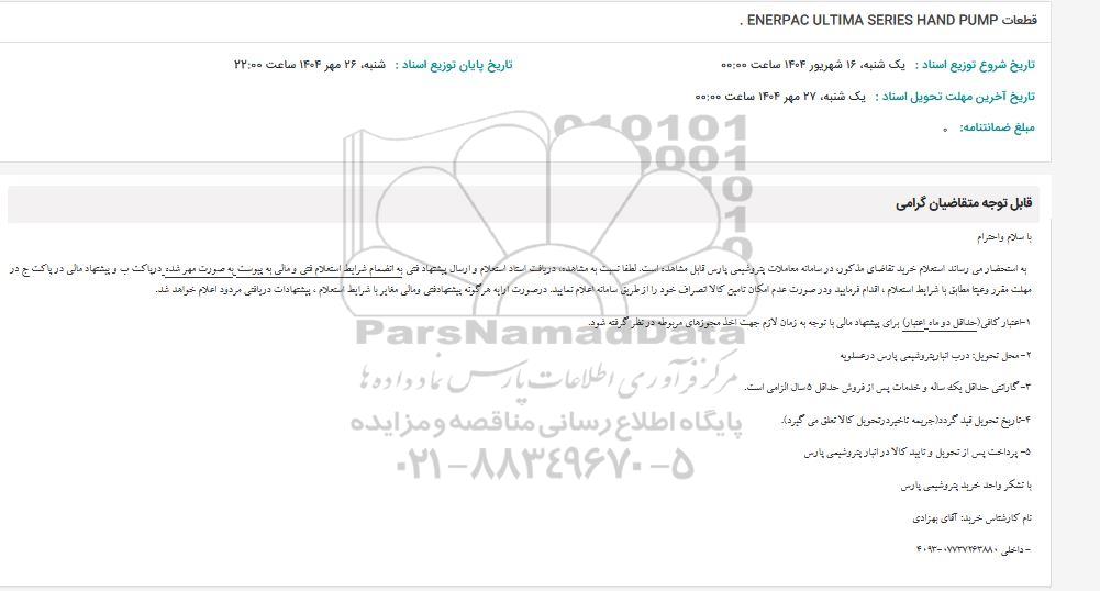 استعلام بها و موضوع استعلام استعلام قطعات ENERPAC ULTIMA SERIES HAND PUMP به اطلاع کلیه شرکتها و افراد متخصص واجد شرایط میرساند، آگهی گذار در نظر دارد از طریق استعلام بها، نسبت به انتخاب و دریافت پیشنهادات اقدام نماید. این استعلام با کد آگهی ثبت شده در سامانه خبرگزاری پارس نماد : 9699238 منتشر شده است. مشخصات استعلام : تاریخ شروع استعلام: 1404/07/22 آخرین مهلت ارسال پیشنهاد قیمت : 1404/07/26 و محل اجرای پروژه : استان بوشهر میباشد. استعلام قیمت مورد درخواست : استعلام قطعات ENERPAC ULTIMA SERIES HAND PUMP با دستهبندیهای تخصصی و گروه های مرتبط : الکتروموتور و پمپ های شناور, تجهیزات نفت و گاز, استعلام اطلاع رسانی میگردد.