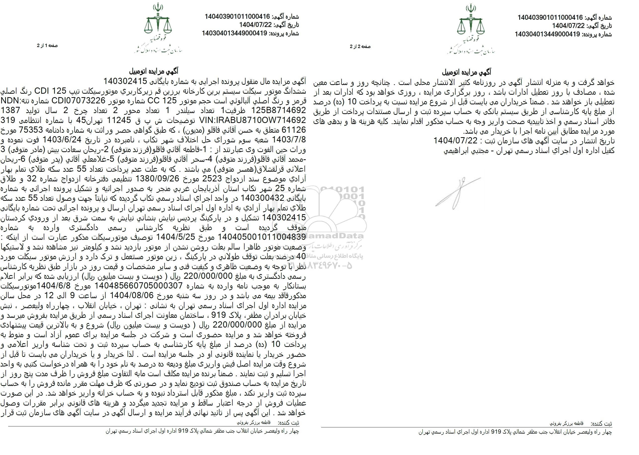 آگهی مزایده مال منقول پرونده اجرایی به شماره بایگانی 140302415 ششدانگ موتور سیکلت سیستم برین کارخانه برزین فم زیر کاربری موتور سیکلت تیپ 125 CDI رنگ اصلی قرمز و رنگ اصلی آلبالونی است حجم موتور 125 CC شماره موتور CDI07073226 شماره تنه NDN 12588714692 ظرفیت 1 تعداد سیلندر 1 تعداد محور 2 تعداد جرح 2 سال تولید 1387 VIN IRABU87100W714692 توضیحات ش ب ق 11245 تهران 45 با شماره انتظامی 319 61126 متعلق به حسن اقاني فاقلو (مديون)، که طبق گواهی حصر وراثت به شماره دادنامه 75353 مورخ 1403.7.8 شعبه سوم شورای حل اختلاف شهر تکاب، نامبرده در تاریخ 1403.6.24 فوت نموده و ورات حين الفوت وی عبارتند از : -1 - فاطمه آقائي فاقلو فرزند (متوفی 2 - ریحان سعادت بیش مادر متوفی 3 محمد أقاني فاقلو (فرزند) (متوفی 4 سحر أقاني فاقلو (فرزند متوفی 5 علامعلي اقاني پدر متوفی) 6- ريحان اعلانی فر لقشلاق همسر (متوفی میباشند. که به علت عدم پرداخت تعداد 55 عدد سکه طلاي تمام بهار آزادي موضوع سند ازدواج 2523 مورخ 1380.09.26 تنظیمی دفترخانه ازدواج شماره 32 و طلاق شماره 25 شهر تکاب استان آذربایجان غربی منجر به صدور اجرائیه و تشکیل پرونده اجرانی به شماره پایگانی 140300432 در واحد اجرای اسناد رسمی تکاب گردیده که دیانا جهت وصول تعداد 55 عدد سكه طلای تمام بهار آزادی به اداره اول اجرای اسناد رسمی تهران ارسال و پرونده اجرائی تحت شماره بایگانی 140302415 تشکیل و در پارکینگ پردیس نیایش بنشانی نیایش به سمت شرق بعد از ورودی کردستان متوقف گردیده است و طبق نظریه کارشناس رسمی دادگستری وارده به شماره 140405001011004839 مورخ 1404.5.25 توصيف موتورسيكلت مذکور عبارت است از اینکه : وضعیت موتور ظاهرا سالم بدت روشن نشدن از موتور بازدید نشد و کیلومتر نیز مشاهده نشد و لاستیکها 40 درصد بعلت توقف طولانی در پارکینگ، زین موتور مستعمل و ترک دارد و ارزش موتور سیکلت مورد نظر با توجه به وضعیت ظاهری و کیفیت فنی و سایر مشخصات و قیمت روز در بازار طبق نظریه کارشناس رسمی دادگستری به مبلغ 220.000.000 ريال ) دویست و بیست میلیون ریال ارزیابی شده که برابر اعلام بستانکار به موجب نامه وارده به شماره 140485660705000307 مورخ 1404.6.8 موتور سيكلت مذکور فاقد بیمه می باشد و در روز سه شنبه مورخ 1404.08.06 از ساعت 9 الی 12 در محل سالن مزایده اداره اول اجرای اسناد رسمی تهران به نشانی : تهران، خیابان انقلاب، چهارراه ولیعصر ، نبش خیابان برادران مظفر پلاک 919 ساختمان معاونت اجرای اسناد رسمی از طریق مزایده بفروش میرسد و مزایده از مبلغ 220.000.000 ريال ) دویست و بیست میلیون ریال شروع و به بالاترین قیمت پیشنهادی فروخته خواهد شد و مزایده حضوری است و شرکت در جلسه مزایده برای عموم آزاد است و منوط به پرداخت 10 (ده) درصد از مبلغ پایه کارشناسی به حساب سپرده ثبت و تحت شناسه واریز اعلامی و حضور خریدار یا نماینده قانونی او در جلسه مزایده است. لذا خریدار و یا خریداران می بایست تا قبل از شروع وقت مزایده اصل فیش واریزی مبلغ ودیعه ده درصد به نام خود را به همراه درخواست کتبی به واحد اجرا تسلیم و ثبت نمایند. ضمناً برنده مزایده مکلف است ما به التفاوت مبلغ فروش را ظرف مدت پنج روز از تاریخ مزایده به حساب صندوق ثبت تودیع نماید و در صورتی که ظرف مهلت مقرر مانده فروش را به حساب سپرده ثبت واریز نکند، مبلغ مذکور قابل استرداد نبوده و به حساب خزانه واریز خواهد شد. در این صورت عطیات فروش از درجه اعتبار ساقط و مزایده تجدید میگردد و هزینه های قانونی برابر مقررات وصول خواهد شد. این آگهی پس از تایید نهایی فرایند مزایده و ارسال آگهی در سایت آگهی های سازمان ثبت قرار خواهد گرفت و به منزله انتشار آگهی در روزنامه کثیر الانتشار محلی است. چنانچه روز و ساعت معین مورد مزایده مطابق آیین نامه اجرا با خریدار می باشد. شده، مصادف با روز تعطیل ادارات باشد، روز برگزاری مزایده، روزی خواهد بود که ادارات بعد از تعطیلی باز خواهند شد. ضمناً خریداران می بایست قبل از شروع مزایده نسبت به پرداخت 10 (ده) درصد از مبلغ پایه کارشناسی از طریق سیستم بانکی به حساب سپرده ثبت و 