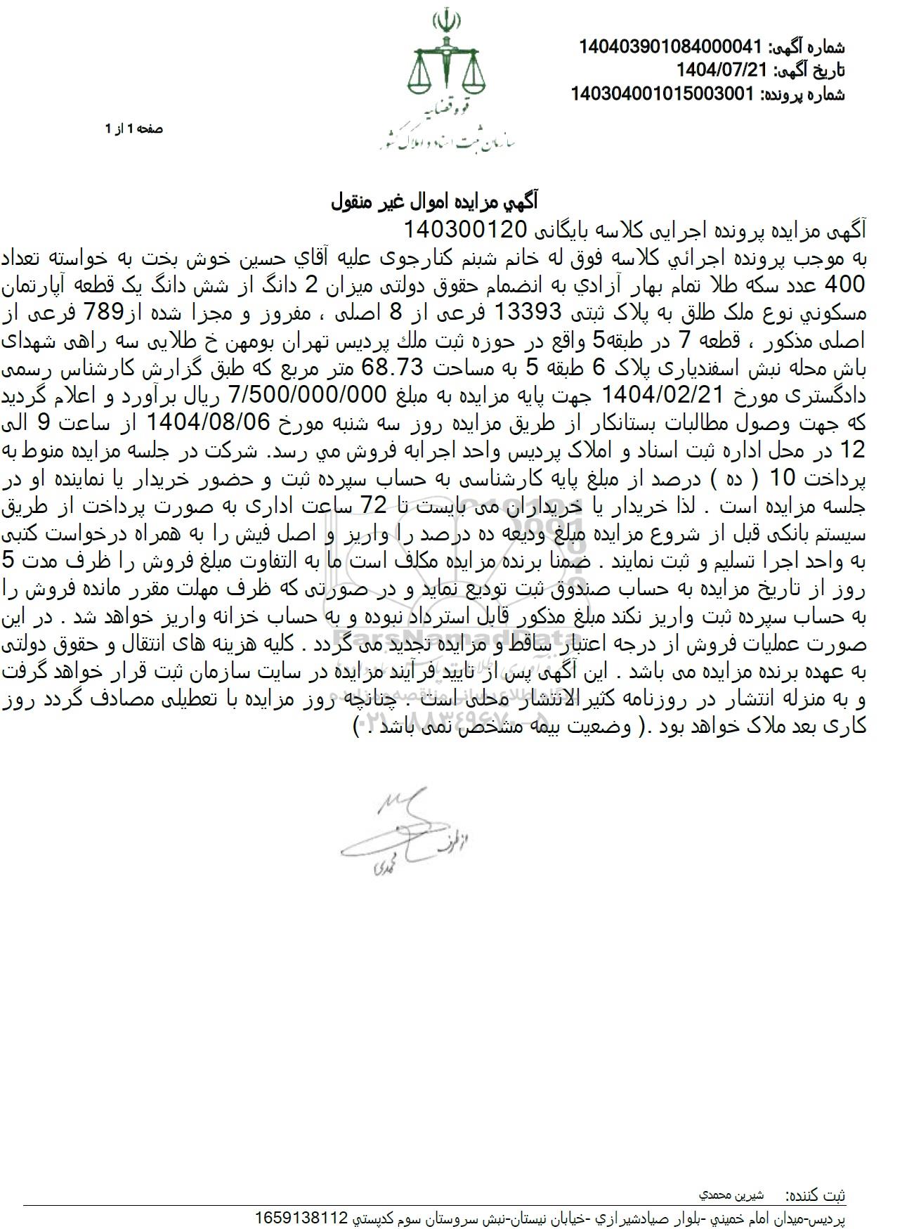 به موجب پرونده اجرائی کلاسه فوق له خانم شبنم کنار جوی علیه آقای حسین خوش بخت به خواسته تعداد 400 عدد سکه طلا تمام بهار آزادی به انضمام حقوق دولتی میزان 2 دانگ از شش دانگ یک قطعه آپارتمان مسکونی نوع ملک طلق به پلاک ثبتی 13393 فرعی از 8 اصلی ، مفروز و مجزا شده از 789 فرعی از اصلی مذکور ، قطعه 7 در طبقه 5 واقع در حوزه ثبت ملک پردیس تهران بومهن خ طلایی سه راهی شهدای باش محله نبش اسفندیاری پلاک 6 طبقه 5 به مساحت 68.73 متر مربع که طبق گزارش کارشناس رسمی دادگستری مورخ 1404.02.21 جهت پایه مزایده به مبلغ 7.500.000.000 ریال برآورد و اعلام گردید که جهت وصول مطالبات بستانکار از طریق مزایده روز سه شنبه مورخ 1404.08.06 از ساعت 9 الی 12 در محل اداره ثبت اسناد و املاک پردیس واحد اجرا به فروش می رسد شرکت در جلسه مزایده منوط به پرداخت 10 (ده ) درصد از مبلغ پایه کارشناسی به حساب سپرده ثبت و حضور خریدار یا نماینده او در جلسه مزایده است. لذا خریدار یا خریداران می بایست تا 72 ساعت اداری به صورت پرداخت از طریق سیستم بانکی قبل از شروع مزایده مبلغ ودیعه ده درصد را واریز و اصل فیش را به همراه درخواست کتبی به واحد اجرا تسلیم و ثبت نمایند. ضمنا برنده مزایده مکلف است ما به التفاوت مبلغ فروش را ظرف مدت 5 روز از تاریخ مزایده به حساب صندوق ثبت تودیع نماید و در صورتی که ظرف مهلت مقرر مانده فروش را به حساب سپرده ثبت واریز نکند مبلغ مذکور قابل استرداد نبوده و به حساب خزانه واریز خواهد شد . در این صورت عملیات فروش از درجه اعتبار ساقط و مزایده تجدید میگردد . کلیه هزینه های انتقال و حقوق دولتی به عهده برنده مزایده میباشد. این آگهی پس از تایید فرآیند مزایده در سایت سازمان ثبت قرار خواهد گرفت و به منزله انتشار در روزنامه کثیر الانتشار محلی است. چنانچه روز مزایده با تعطیلی مصادف گردد روز کاری بعد ملاک خواهد بود . ( وضعیت بیمه مشخص نمی باشد . )