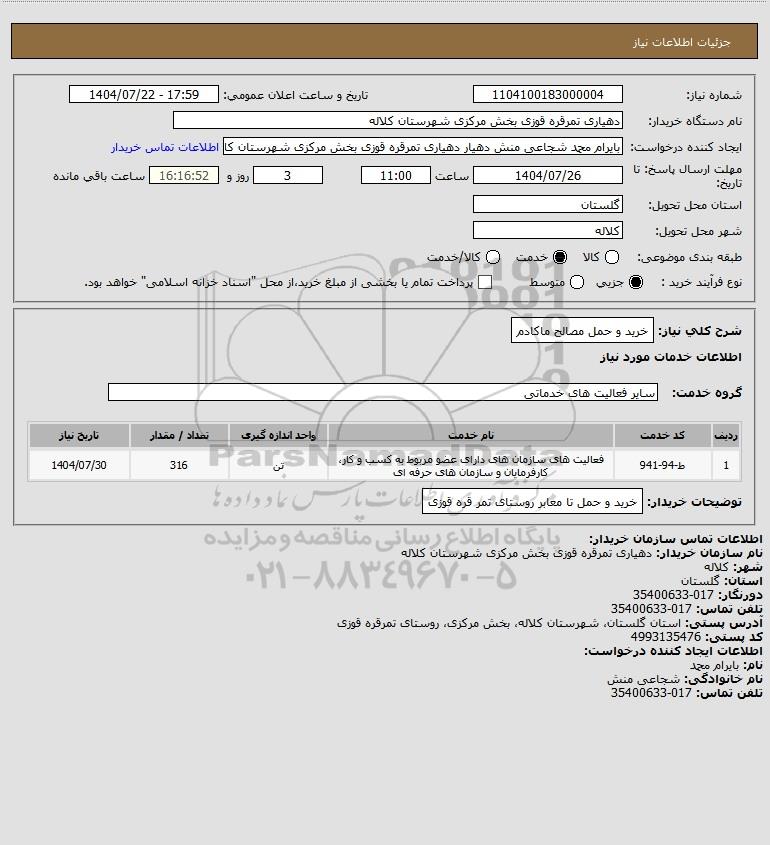 شرح کلی نیاز: خرید و حمل مصالح ماکادم