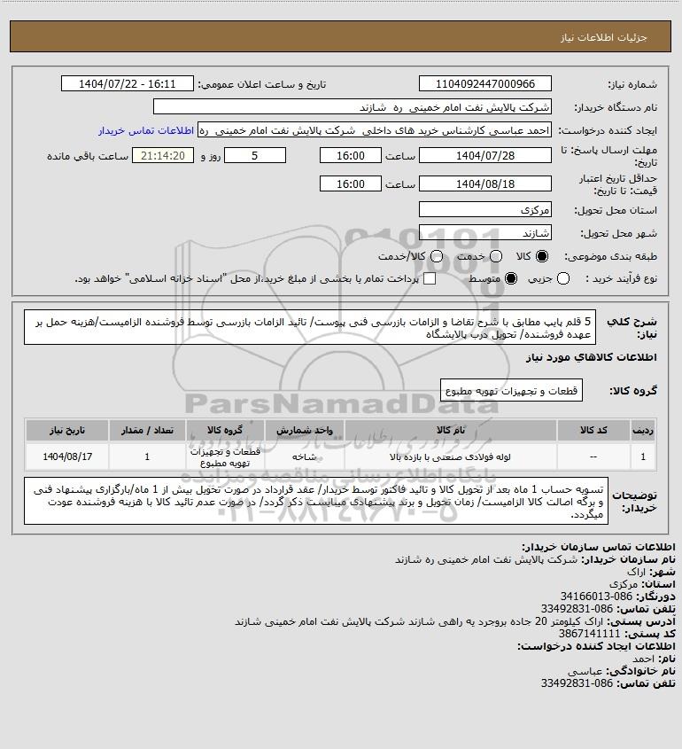 شرح کلی نیاز: 5 قلم پایپ مطابق با شرح تقاضا و الزامات بازرسی فنی پیوست/ تائید الزامات بازرسی توسط فروشنده الزامیست/هزینه حمل بر عهده فروشنده/ تحویل درب پالایشگاه
