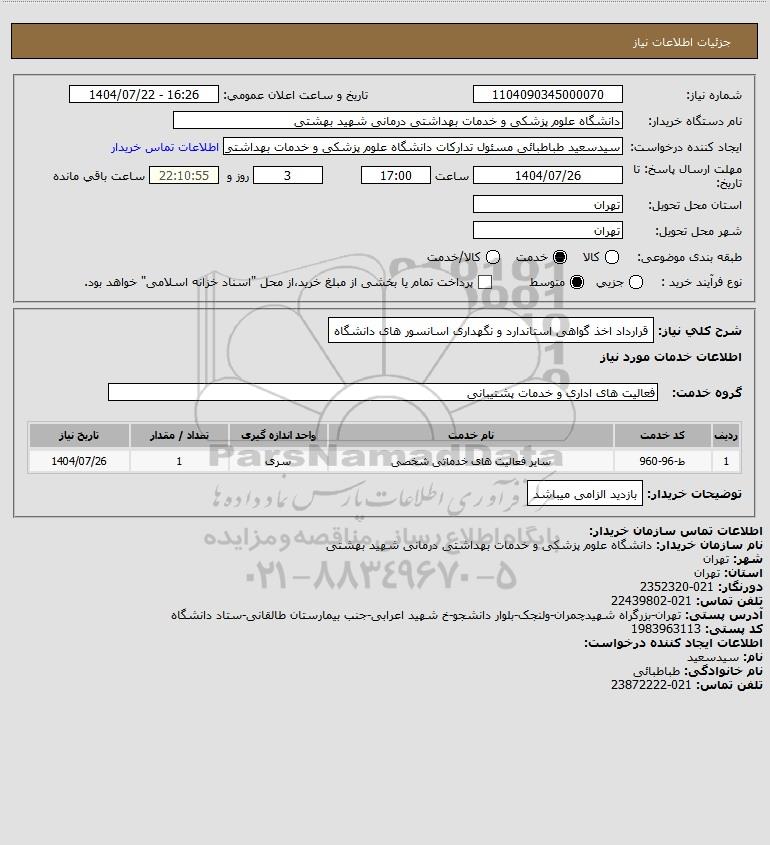 نام سازمان خریدار: دانشگاه علوم پزشکی و خدمات بهداشتی درمانی شهید بهشتی