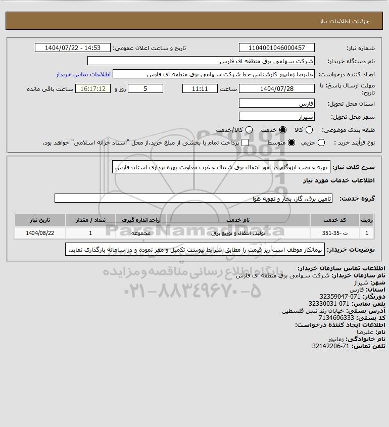 شرح کلی نیاز: تهیه و نصب ایزوگام در امور انتقال برق شمال و غرب معاونت بهره برداری استان فارس
