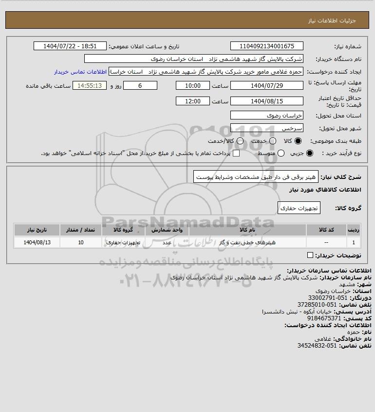 نام دستگاه خریدار:شرکت پالایش گاز شهید هاشمی نژاد استان خراسان رضوی