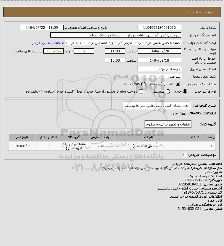 | 1 | -- | پمپ دستی (هند پمپ) | عدد | قطعات و تجهیزات تهویه مطبوع | 2 | 1404/08/03 |