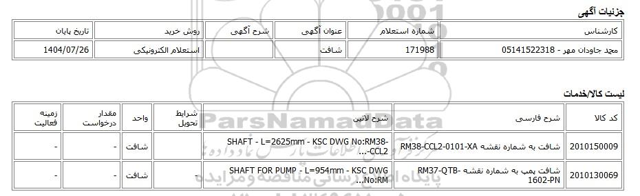 2010150009شافت به شماره نقشه RM38-CCL2-0101-XASHAFT - L=2625mm - KSC DWG No:RM38-CCL2-... شافت--