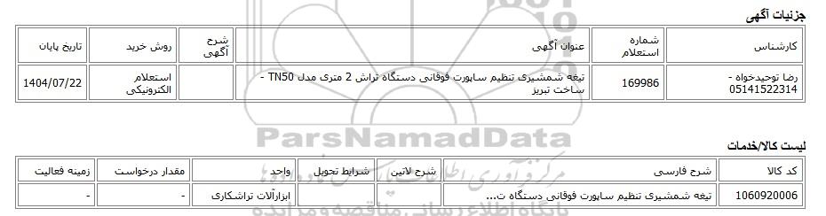 رضا توحیدخواه - 05141522314169986تیغه شمشیری تنظیم ساپورت فوقانی دستگاه تراش 2 متری مدل TN50 - ساخت تبریزاستعلام الکترونیکی1404/07/22