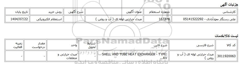 استعلام الکترونیکی مبدل حرارتی لوله ای ( آب و روغن ), استعلام الکترونیکی، مبدل حرارتی لوله ای ( آب و روغن )