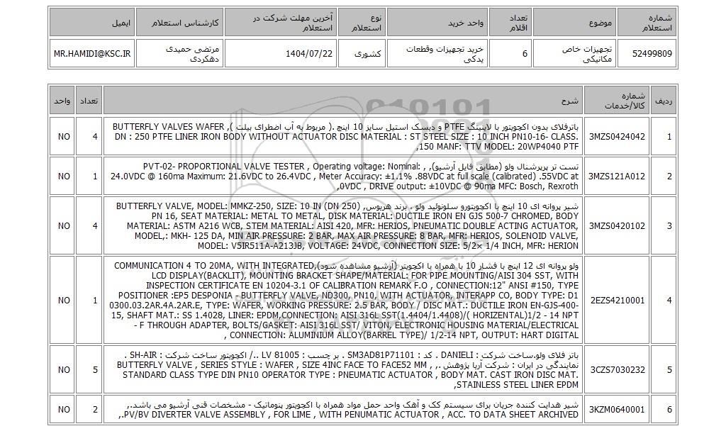 52499809 | تجهیزات خاص مکانیکی | 6 | خرید تجهیزات وقطعات یدکی | کشوری | 1404/07/22 | مرتضی حمیدی دهکردی | MR.HAMIDI@KSC.IR |