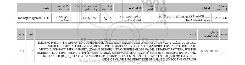 52501886 | شیر Shut-Off الکترونیوماتیکی، سایز 3 اینچ، کلاس فشاری PN.16 | 1 | ساخت تجهیزات و قطعات یدکی | کشوری | 1404/07/20 | محمد نجفی بیرگانی | mh.najafibirgani@KSC.IR |