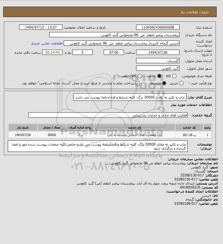 شرح کلی نیاز: چاپ و تکثیر به مقدار 30000 برگ- کلیه شرایط و قرادادنامه پیوست می باشد