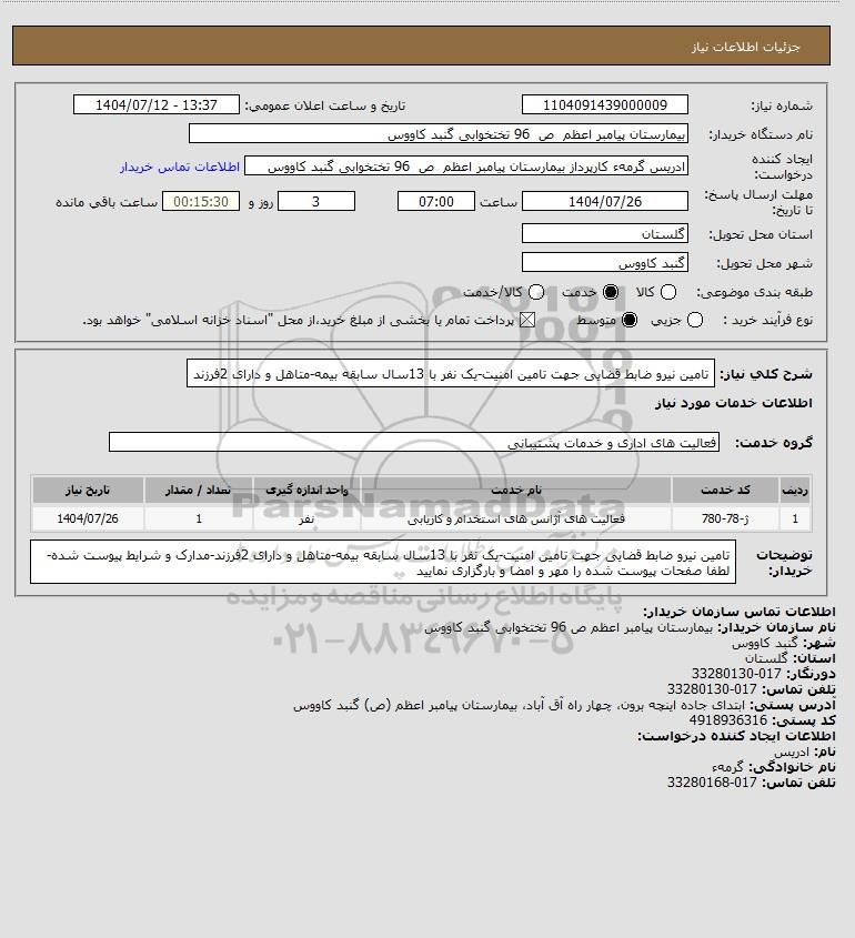 شرح کلی نیاز: تامین نیرو ضابط قضایی جهت تامین امنیت-یک نفر با 13سال سابقه بیمه-متاهل و دارای 2فرزند