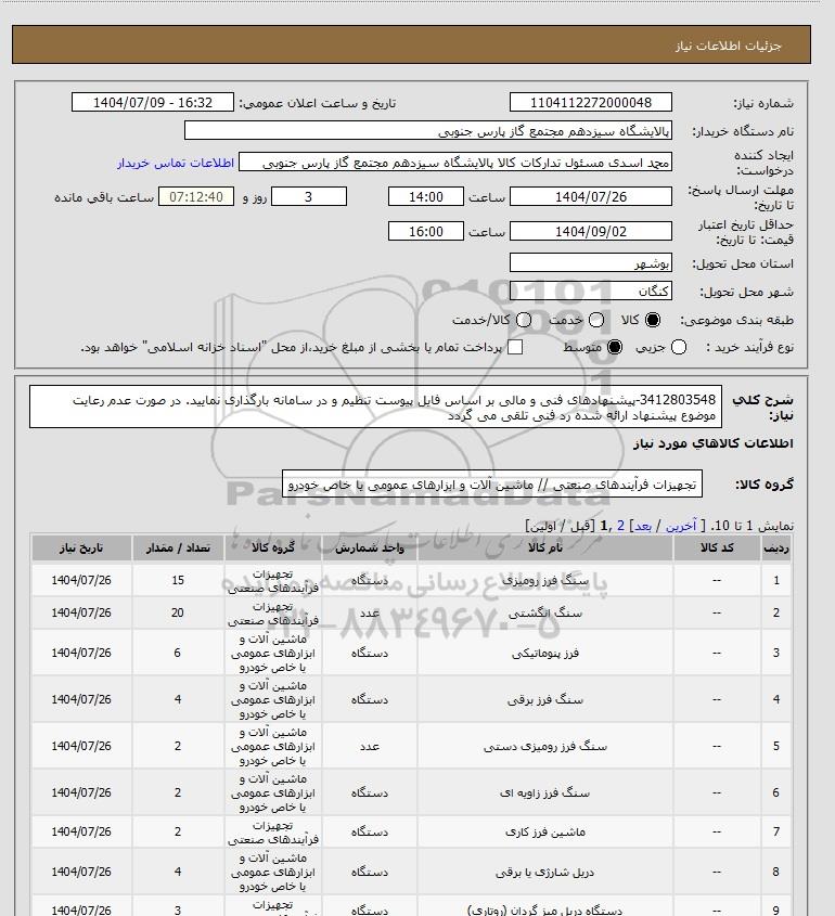 شرح کلی نیاز: 3412803548-پیشنهادهای فنی و مالی بر اساس فایل پیوست تنظیم و در سامانه بارگذاری نمایید. در صورت عدم رعایت موضوع پیشنهاد ارائه شده رد فنی تلقی می گردد