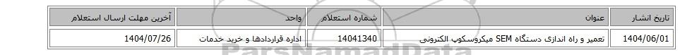 | 1404/06/01 | تعمیر و راه اندازی دستگاه SEM میکروسکوپ الکترونی | 14041340 | اداره قراردادها و خرید خدمات | 1404/07/26 |