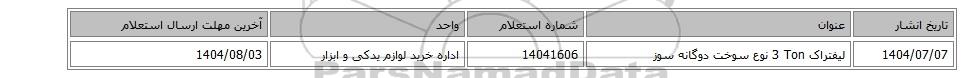 | 1404/07/07 | لیفتراک 3 Ton نوع سوخت دوگانه سوز | 14041606 | اداره خرید لوازم یدکی و ابزار | 1404/08/03 |