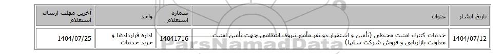 | 1404/07/12 | خدمات کنترل امنیت محیطی (تأمین و استقرار دو نفر مأمور نیروی انتظامی جهت تأمین امنیت معاونت بازاریابی و فروش شرکت سایپا) | 14041716 | اداره قراردادها و خرید خدمات | 1404/07/25 |