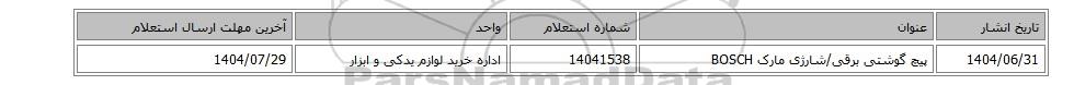 | 1404/06/31 | پیچ گوشتی برقی/شارژی مارک BOSCH | 14041538 | اداره خرید لوازم یدکی و ابزار | 1404/07/29 |