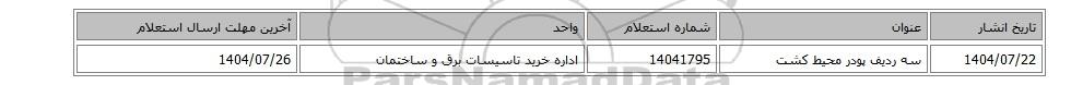 | تاریخ انشار | عنوان | شماره استعلام | واحد | آخرین مهلت ارسال استعلام |
