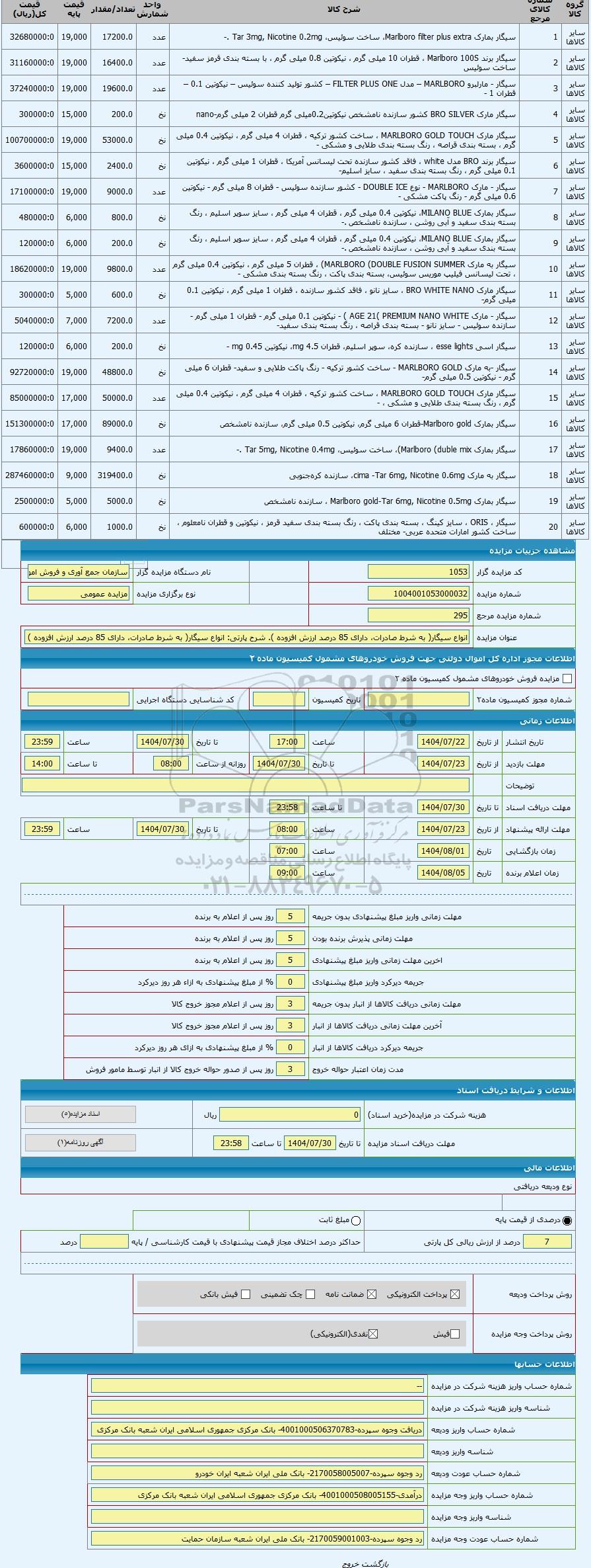 | عنوان مزایده | انواع سیگار( به شرط صادرات، دارای 85 درصد ارزش افزوده ) | |||