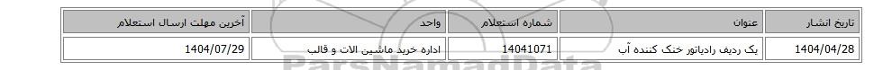 | 1404/04/28 | یک ردیف رادیاتور خنک کننده آب | 14041071 | اداره خرید ماشین الات و قالب | 1404/07/29 |