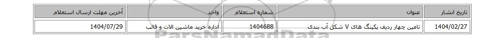 | 1404/02/27 | تامین چهار ردیف پکینگ های V شکل آب بندی | 1404688 | اداره خرید ماشین الات و قالب | 1404/07/29 |
