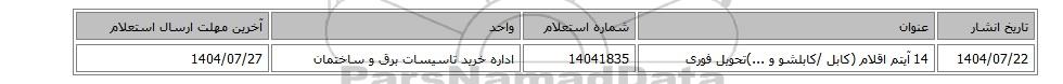 1404/07/2214 آیتم اقلام (کابل /کابلشو و ...)تحویل فوری14041835اداره خرید تاسیسات برق و ساختمان1404/07/27