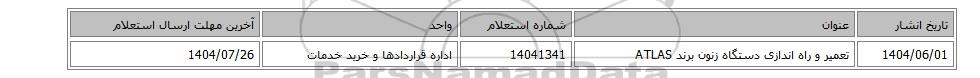 | 1404/06/01 | تعمیر و راه اندازی دستگاه زنون برند ATLAS | 14041341 | اداره قراردادها و خرید خدمات | 1404/07/26 |