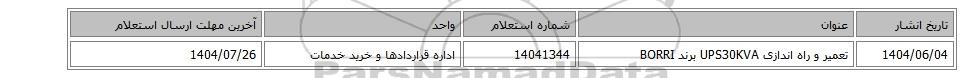 1404/06/04تعمیر و راه اندازی UPS30KVA برند BORRI14041344اداره قراردادها و خرید خدمات1404/07/26