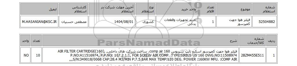 | 52504882 | فیلتر هوا جهت کمپرسور | 1 | خرید تجهیزات وقطعات یدکی | کشوری | 1404/08/01 | مصطفی حسنیان | M.HASANIAN@KSC.IR |