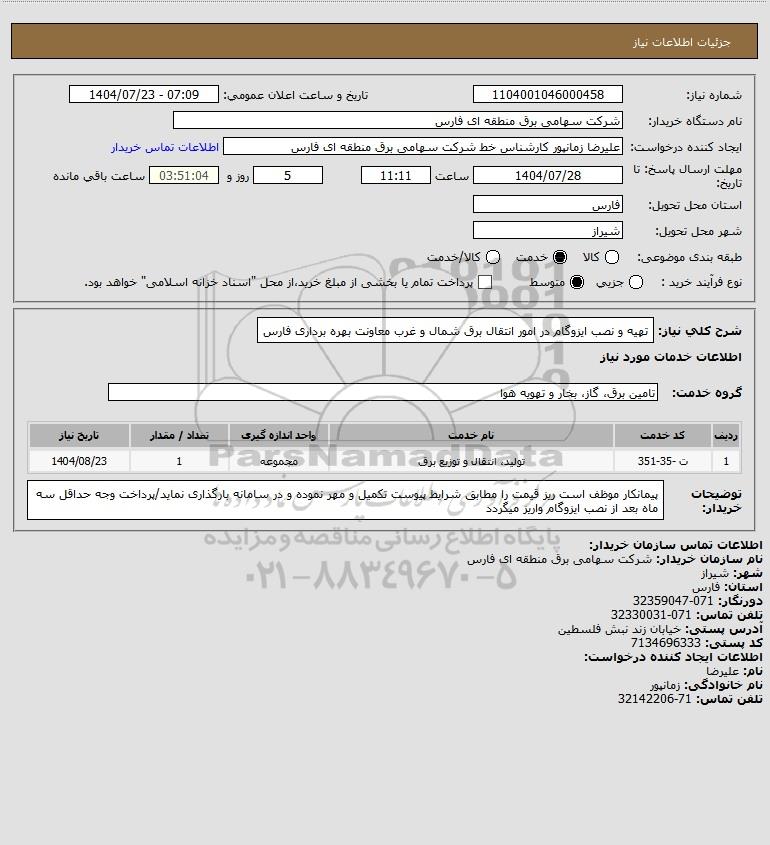 نام سازمان خریدار: شرکت سهامی برق منطقه ای فارس