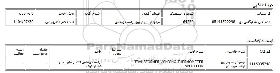 | مصطفی شایگانی پور - 05141522298 | 164270 | ترمومتر سیم پیچ ترانسفورماتور | استعلام الکترونیکی | 1404/07/30 |