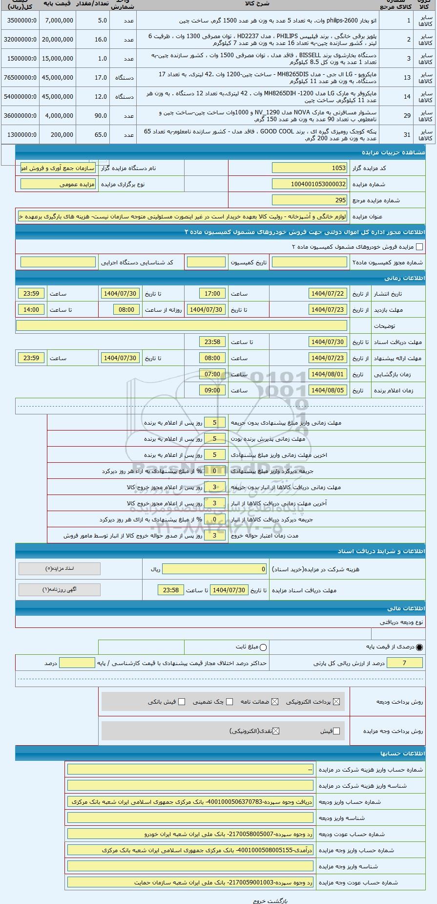 | کد مزایده گزار | 1053 | نام دستگاه مزایده گزار | سازمان جمع آوری و فروش اموال تملیکی | |
