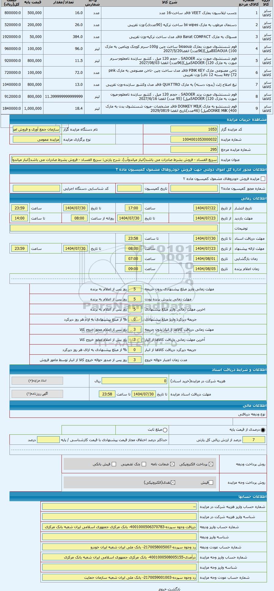کد مزایده گزار1053نام دستگاه مزایده گزارسازمان جمع آوری و فروش اموال تملیکی