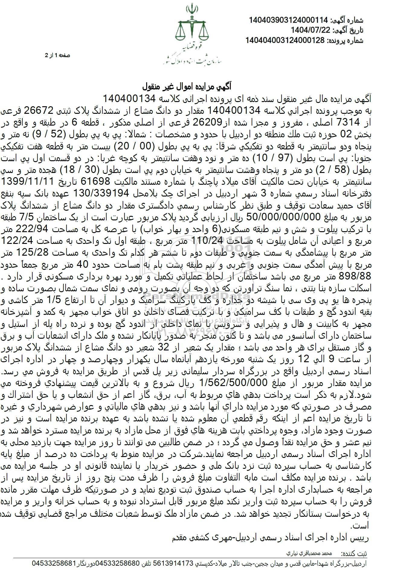 آگهی مزایده مال غیر منقول سند ذمه ای پرونده اجرائی کلاسه 140400134 به موجب پرونده اجرائی کلاسه 140400134 مقدار دو دانگ مشاع از ششدانگ پلاک ثبتی 26672 فرعی از 7314 اصلی ، مفروز و مجزا شده از 26209 فرعی از اصلی مذکور ، قطعه 6 در طبقه و واقع در بخش 02 حوزه ثبت ملک منطقه دو اردبیل با حدود و مشخصات : شمالا پی به پی بطول (52 . 9) نه متر و پنجاه و دو سانتیمتر به قطعه دو تفکیکی شرقا پی به پی بطول 00 . 20) بیست متر به قطعه هفت تفکیکی جنوبا پی است بطول (97) . (10) ده متر و نود و هفت سانتیمتر به کوچه غربا در دو قسمت اول پی است بطول (58) . (2) دو متر و پنجاه و هشت سانتیمتر به خیابان دوم پی است بطول 30 . 18) هجده متر و سی سانتیمتر به خیابان تحت مالکیت آقای میلاد پاچنگ با شماره مستند مالکیت 61698 تاریخ 1399.11.11 دفترخانه اسناد رسمی شماره 3 شهر اردبیل در اجرای چک بلامحل 130.339194 عهده بانک سپه بنفع آقای حمید سعادت توقیف و طبق نظر کارشناس رسمی دادگستری مقدار دو دانگ مشاع از ششدانگ پلاک مزبور به مبلغ 50.000.000.000 ریال ارزیابی گردید پلاک مزبور عبارت است از یک ساختمان 7.5 طبقه با ترکیب پیلوت و شش و نیم طبقه مسکونی (6) واحد) و بهار (خواب با عرصه کل به مساحت 222.94 متر مربع و اعیانی آن شامل پیلوت به مساحت 110.24 متر مربع ، طبقه اول تک واحدی به مساحت 122.24 متر مربع با پیشامدگی به سمت جنوبی و طبقات دوم تا ششم هر کدام تک واحدی به مساحت 125.28 متر مربع با پیش آمدگی سمت جنوبی و غربی و نیم طبقه پشت بام به مساحت حدود 40 متر مربع جمعاً حدود 898.88 متر مربع میباشد ساختمان از لحاظ عملیاتی تکمیل و مورد بهره برداری مسکونی قرار دارد . اسکلت سازه بنا بتنی ، نما سنگ تراورتن که دو وجه آن بصورت رومی و نمای سمت شمال بصورت ساده و پنجره ها یو پی وی سی با شیشه دو جداره و کف پارکینگ سرامیک و دیوار آن تا ارتفاع 1.5 متر کاشی و بقیه اندود گچ و طبقات با کف سرامیکی و با ترکیب فضای داخلی دو اتاق خواب مجهز به کمد و آشپزخانه مجهز به کابینت و هال و پذیرایی و سرویس با نمای داخلی از اندود گچ بوده و نرده راه پله از استیل و ساختمان دارای آسانسور میباشد و تا کنون منجر به صدور پایانکار نشده و ملک دارای انشعابات آب و برق و گاز مستقل برای هر واحد میباشد ؛ مقدار یک شعیر از 32 شعیر دو دانگ مشاع از ششدانگ پلاک مزبور از ساعت 9 الی 12 روز یک شنبه مورخه یازدهم آبانماه سال یکهزار و چهارصد و چهار در اداره اجرای اسناد رسمی اردبیل واقع در بزرگراه سردار سلیمانی زیر پل قدس از طریق مزایده به فروش می رسد. مزایده مقدار مزبور از مبلغ 1.562.500.000 ریال شروع و به بالاترین قیمت پیشنهادی فروخته می شود. لازم به ذکر است پرداخت بدهی های مربوط به آب برق گاز اعم از حق انشعاب و یا حق اشتراک و مصرف در صورتی که مورد مزایده دارای آنها باشد و نیز بدهی های مالیاتی و عوارض شهرداری و غیره تا تاریخ مزایده اعم از اینکه رقم قطعی آن معلوم شده یا نشده باشد به عهده برنده مزایده است و نیز در صورت وجود مازاد، وجوه پرداختی بابت هزینه های فوق از محل مازاد به برنده مزایده مسترد خواهد شد و نیم عشر و حق مزایده نقداً وصول میگردد؛ در ضمن طالبین میتوانند تا روز مزایده جهت بازدید محلی به اداره اجرای اسناد رسمی اردبیل مراجعه نمایند. شرکت در مزایده منوط به پرداخت ده درصد از مبلغ پایه کارشناسی به حساب سپرده ثبت نزد بانک ملی و حضور خریدار یا نماینده قانونی او در جلسه مزایده می باشد. برنده مزایده مکلف است ما به التفاوت مبلغ فروش را ظرف مدت پنج روز از تاریخ مزایده پس از مراجعه به حسابداری اداره اجرا به حساب صندوق ثبت تودیع نماید و در صورتیکه ظرف مهلت مقرر مانده فروش را به حساب سپرده ثبت واریز نکند مبلغ مزبور قابل استرداد نبوده و به حساب خزانه واریز و مزایده به درخواست بستانکار تجدید خواهد شد. در ضمن مازاد ملک توسط شعبات مختلف مراجع قضایی توقیف شده است.