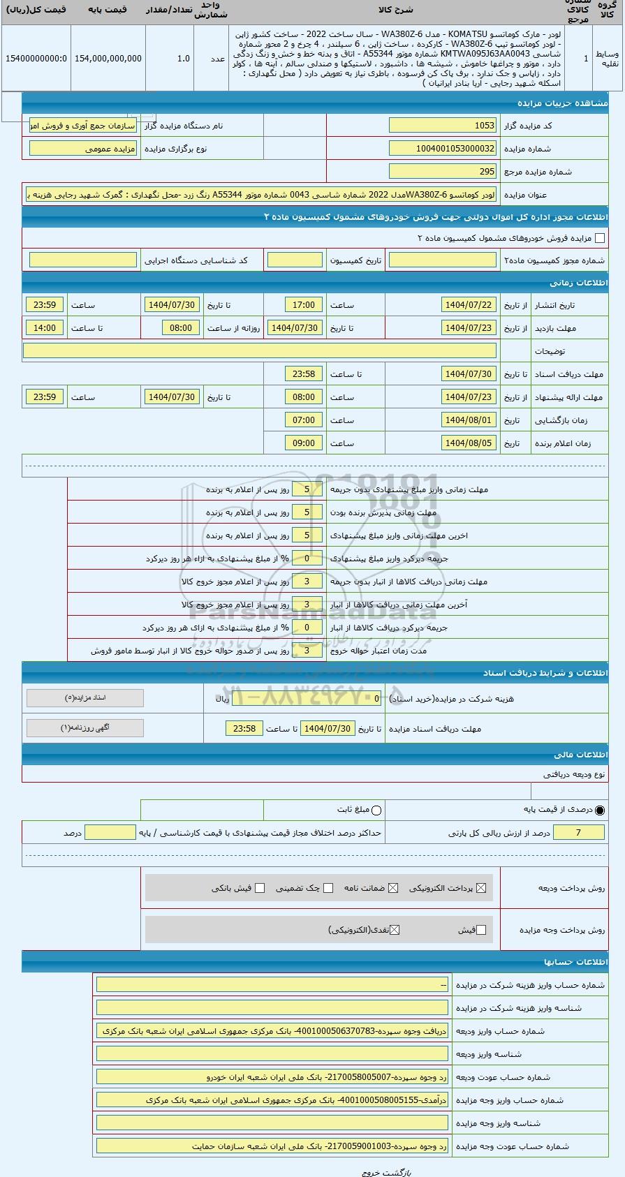 عنوان مزایدهلودر کوماتسو WA380Z-6مدل 2022 شماره شاسی 0043 شماره موتور A55344 رنگ زرد -محل نگهداری : گمرک شهید رجایی هزینه بیمه- خروج کالاهای بفروش رفته درمزایده ها به دلیل حجم بالای کالاهای این مدیریت طبق زمانبندی به خریداران اعلام می گردد ضمنا خریداران درزمان بازدید،هیچگونه خروجی از پرونده های مزایده صورت نمی پذیردو زمان بازدیداز ساعت 9 الی پایان وقت اداری می باشد.بازدید الزامی می باشد در غیر اینصورت مسئولیت آن به عهده خریدار می باشد.قابل توجه خریداران محترم:به دلیل حجم بالای فعالیت های این مدیریت در گمرک شهید رجائی یک روز بعد از بارگیری ،کالا خارج می گردد و به خریدار تحویل می گردد. ضمناٌ خریداران قبل از مراجعه به استان هماهنگی لازم جهت انجام امورات اداری و اخذ مجوز بارگیری انجام نمایند و با نماینده این مدیریت هماهنگ نمایند و در صورت مراجعه بدون هماهنگی هیچگونه مسئولیتی متوجه این سازمان و گمرک نمی باشد. شماره تماس جهت هماهنگی برای خروج کالا : آقای مرادی 09171235248 -وسیله نقلیه به صورت موتور خاموش با وضعیت موجود و به شرط رؤیت متقاضی در مزایده عرضه و تحویل می گردد و این سازمان هیچگونه تعهدی در خصوص مشخصات کمی و کیفی دستگاه تحویلی ندارد و در صورت عدم رؤیت عواقب ناشی از آن با خریدار خواهد بود.پرداخت کلیه هزینه های موضوع انبارداری و حسب مورد حقوق ورودی و سایر هزینه های ترخیص بر عهده سازمان می باشد.در موارد تایید مشروط استاندارد،خریدار موظف است ضمن تکمیل فرم تعهدنامه متقاضی به شماره مدرک 152/269-5 ک مربوط به سازمان ملی استاندارد، موارد اعلامی را رفع اقدام نماید و تعهد محضری در این خصوص از برنده مزایده اخذ می گردد(تاکید می گردد که درج عدد (صفر) در بخش مشخصات فنی وسایل نقلیه به هیچ عنوان به منزله عدم تعلق هرگونه هزینه مرتبط با آن نخواهد بود.مزایده گران محترم ملزم می باشند کلیه هزینه های مربوط از جمله هزینه های شماره گذاری وسایل نقلیه را با مفاد تعهد نامه شماره (03-م-01/1ف) مندرج در اسناد مزایده مورد مداقله واقدام قرار دهندشرایط پرداخت (ضمانت نامه بانکی سه ماهه و اخذ پیش پرداخت نقدی به میزان 10% مبلغ پیشنهادی و پرداخت 10% مالیات بر ارزش افزوده به صورت نقدی امکان پذیر می باشد)