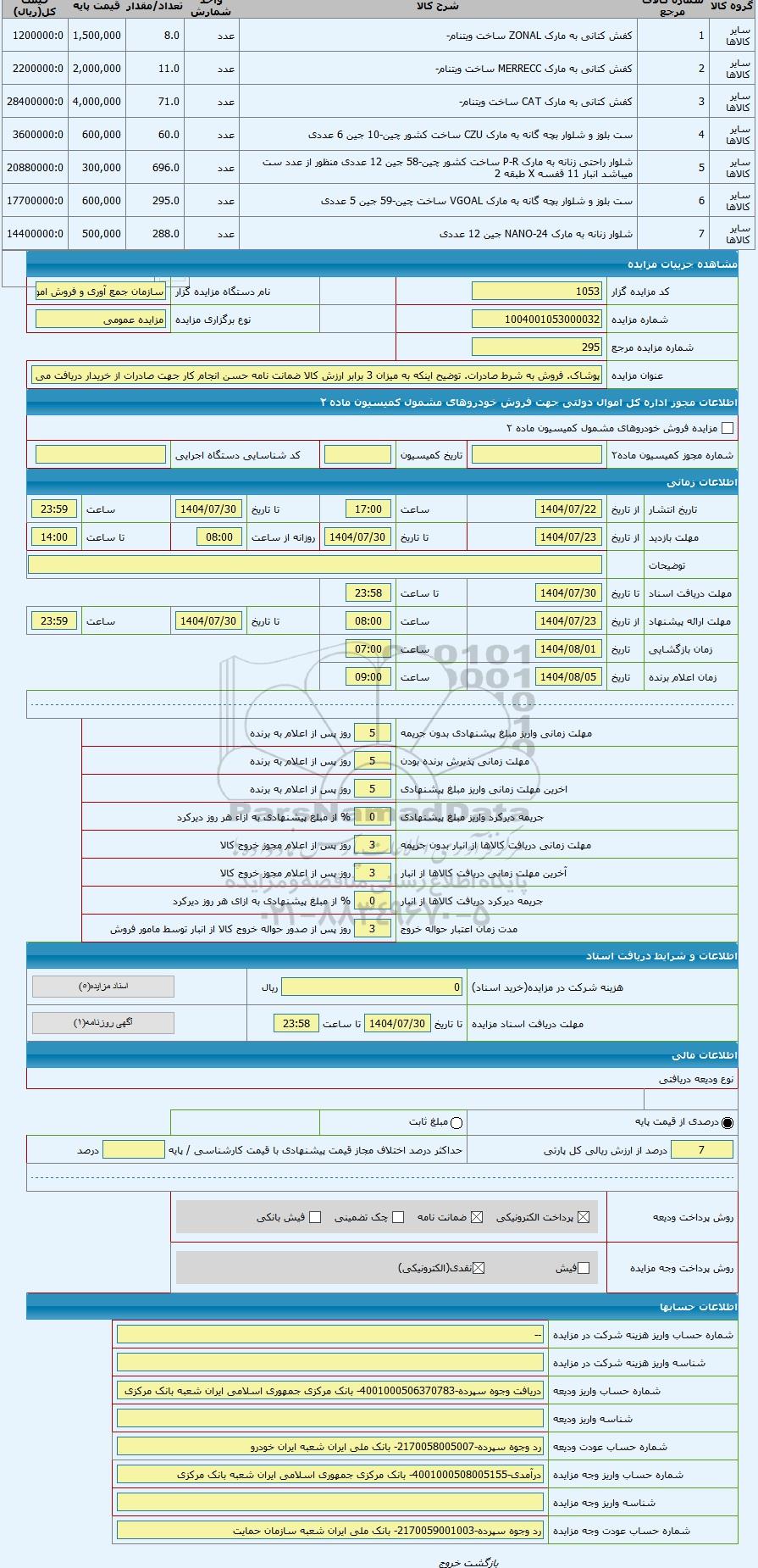 مزایده ، پوشاک. فروش به شرط صادرات. توضیح اینکه به میزان 3 برابر ارزش کالا ضمانت نامه حسن انجام کار جهت صادرات از خریدار دریافت