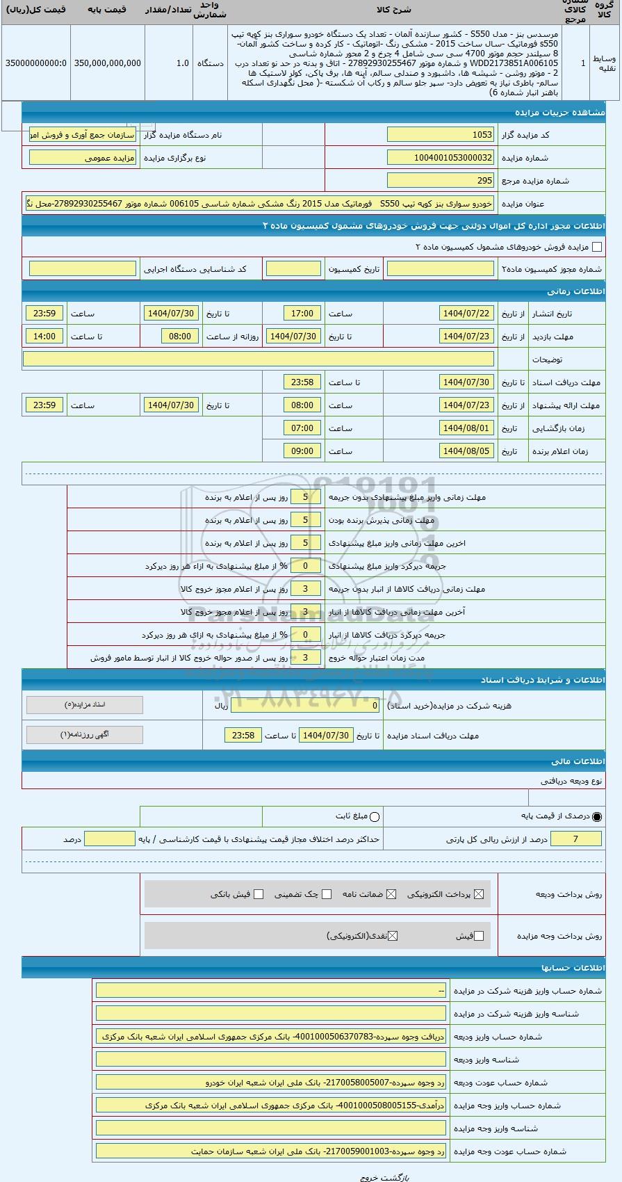 | کد مزایده گزار | 1053 | نام دستگاه مزایده گزار | سازمان جمع آوری و فروش اموال تملیکی | |
