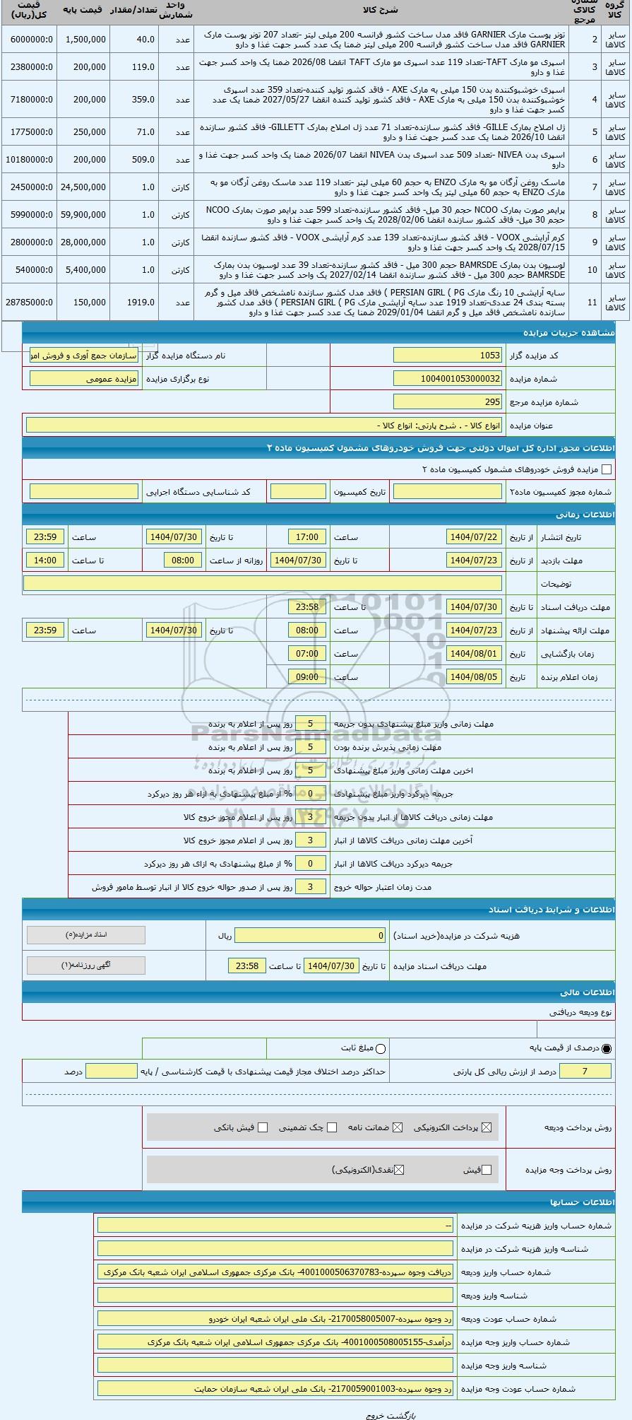 | عنوان مزایده | انواع کالا - "فروش به شرط صادرات" - به شرط بازدید - محل نگهداری : انبار شقایق | |||