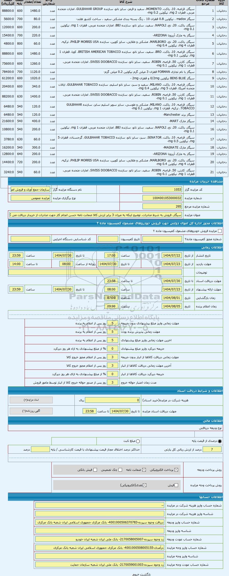 مزایده عمومی مزایده سیگار. فروش به شرط صادرات. توضیح اینکه به میزان 3 برابر ارزش کالا ضمانت نامه حسن انجام کار جهت صادرات از خریدار دریافت برگزار میگردد. از کلیه افراد متخصص و شرکتهای واجد شرایط دعوت به عمل میآید تا در این مزایده با کد خبرگزاری پارس نماد : 9700630 شرکت نمایند تاریخ شروع مزایده : 1404/07/22 مهلت شرکت در مزایده: تا پایان روز 1404/07/30 مکان برگزاری اموال واگذاری استانهای تهران و دستهبندیهای مربوط به این حراجی متفرقه میباشد.