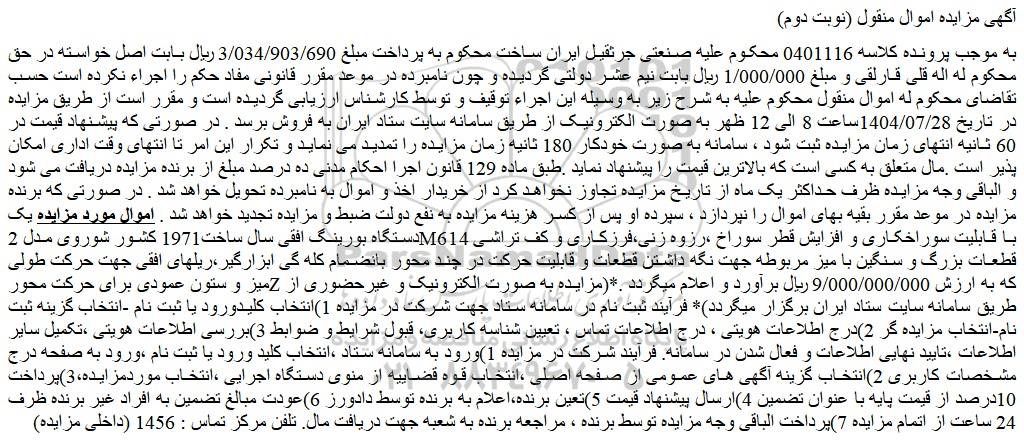 به موجب پرونده کلاسه 0401116 محکوم علیه صنعتی جرثقیل ایران ساخت محکوم به پرداخت مبلغ 3/034/903/690 ریال بابت اصل خواسته در حق محکوم له اله قلی قارلقی و مبلغ 1/000/000 ریال بابت نیم عشر دولتی گردیده و چون نامبرده در موعد مقرر قانونی مفاد حکم را اجراء نکرده است حسب تقاضای محکوم له اموال منقول محکوم علیه به شرح زیر به وسیله این اجراء توقیف و توسط کارشناس ارزیابی گردیده است و مقرر است از طریق مزایده در تاریخ 1404/07/28ساعت 8 الی 12 ظهر به صورت الکترونیک از طریق سامانه سایت ستاد ایران به فروش برسد . در صورتی که پیشنهاد قیمت در 60 ثانیه انتهای زمان مزایده ثبت شود ، سامانه به صورت خودکار 180 ثانیه زمان مزایده را تمدید می نماید و تکرار این امر تا انتهای وقت اداری امکان پذیر است .مال متعلق به کسی است که بالاترین قیمت را پیشنهاد نماید .طبق ماده 129 قانون اجرا احکام مدنی ده درصد مبلغ از برنده مزایده دریافت می شود و الباقی وجه مزایده ظرف حداکثر یک ماه از تاریخ مزایده تجاوز نخواهد کرد از خریدار اخذ و اموال به نامبرده تحویل خواهد شد . در صورتی که برنده مزایده در موعد مقرر بقیه بهای اموال را نپردازد ، سپرده او پس از کسر هزینه مزایده به نفع دولت ضبط و مزایده تجدید خواهد شد . اموال مورد مزایده یک دستگاه بورینگ افقی سال ساخت1971 کشور شوروی مدل 2m614 با قابلیت سوراخکاری و افزایش قطر سوراخ ،رزوه زنی،فرزکاری و کف تراشی قطعات بزرگ و سنگین با میز مربوطه جهت نگه داشتن قطعات و قابلیت حرکت در چند محور بانضمام کله گی ابزارگیر،ریلهای افقی جهت حرکت طولی میز و ستون عمودی برای حرکت محورz که به ارزش 9/000/000/000 ریال برآورد و اعلام میگردد .*(مزایده به صورت الکترونیک و غیرحضوری از طریق سامانه سایت ستاد ایران برگزار میگردد)* فرآیند ثبت نام در سامانه ستاد جهت شرکت در مزایده 1)انتخاب کلیدورود یا ثبت نام -انتخاب گزینه ثبت نام-انتخاب مزایده گر 2)درج اطلاعات هویتی ، درج اطلاعات تماس ، تعیین شناسه کاربری، قبول شرایط و ضوابط 3)بررسی اطلاعات هویتی ،تکمیل سایر اطلاعات ،تایید نهایی اطلاعات و فعال شدن در سامانه. فرآیند شرکت در مزایده 1)ورود به سامانه ستاد ،انتخاب کلید ورود یا ثبت نام ،ورود به صفحه درج مشخصات کاربری 2)انتخاب گزینه آگهی های عمومی از صفحه اصلی ،انتخاب قوه قضاییه از منوی دستگاه اجرایی ،انتخاب موردمزایده،3)پرداخت 10درصد از قیمت پایه با عنوان تضمین 4)ارسال پیشنهاد قیمت 5)تعین برنده،اعلام به برنده توسط دادورز 6)عودت مبالغ تضمین به افراد غیر برنده ظرف 24 ساعت از اتمام مزایده 7)پرداخت الباقی وجه مزایده توسط برنده ، مراجعه برنده به شعبه جهت دریافت مال. تلفن مرکز تماس : 1456 (داخلی مزایده)