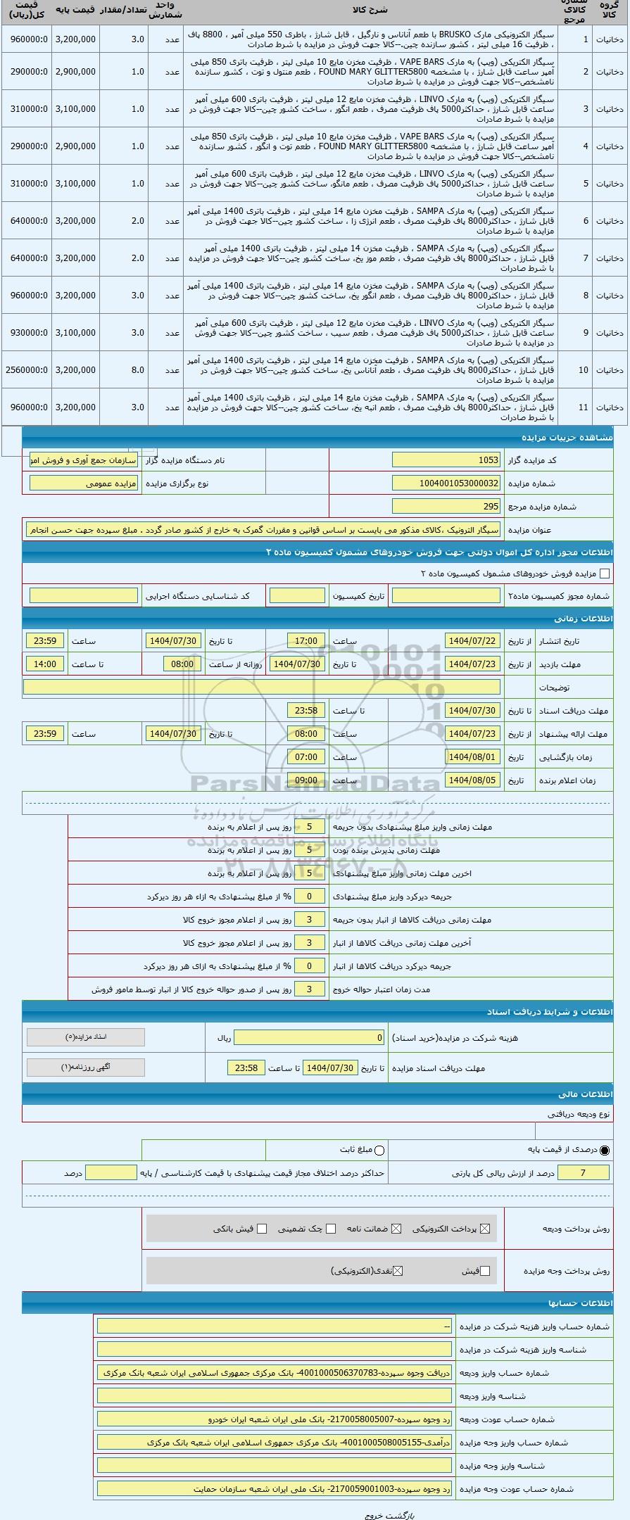 | عنوان مزایده | سیگار الترونیک ،کالای مذکور می بایست بر اساس قوانین و مقررات گمرک به خارج از کشور صادر گردد . مبلغ سپرده جهت حسن انجام کار ( صدور ضمانتنامه بانکی ) در وجه سازمان ،3 برابر ارزش کالا از خریدار اخذ می گردد . استرداد سپرده منوط به تحویل کالای خریداری شده به گمرک جهت صادرات می باشد . لذا تائید خروج کالا از سوی گمرک الزامی است .کالا با وضعیت موجود ارزیابی شده و بازدید الزامیست ، عدم دقت متوجه برنده مزایده و پارتی خواهد بود . | |||