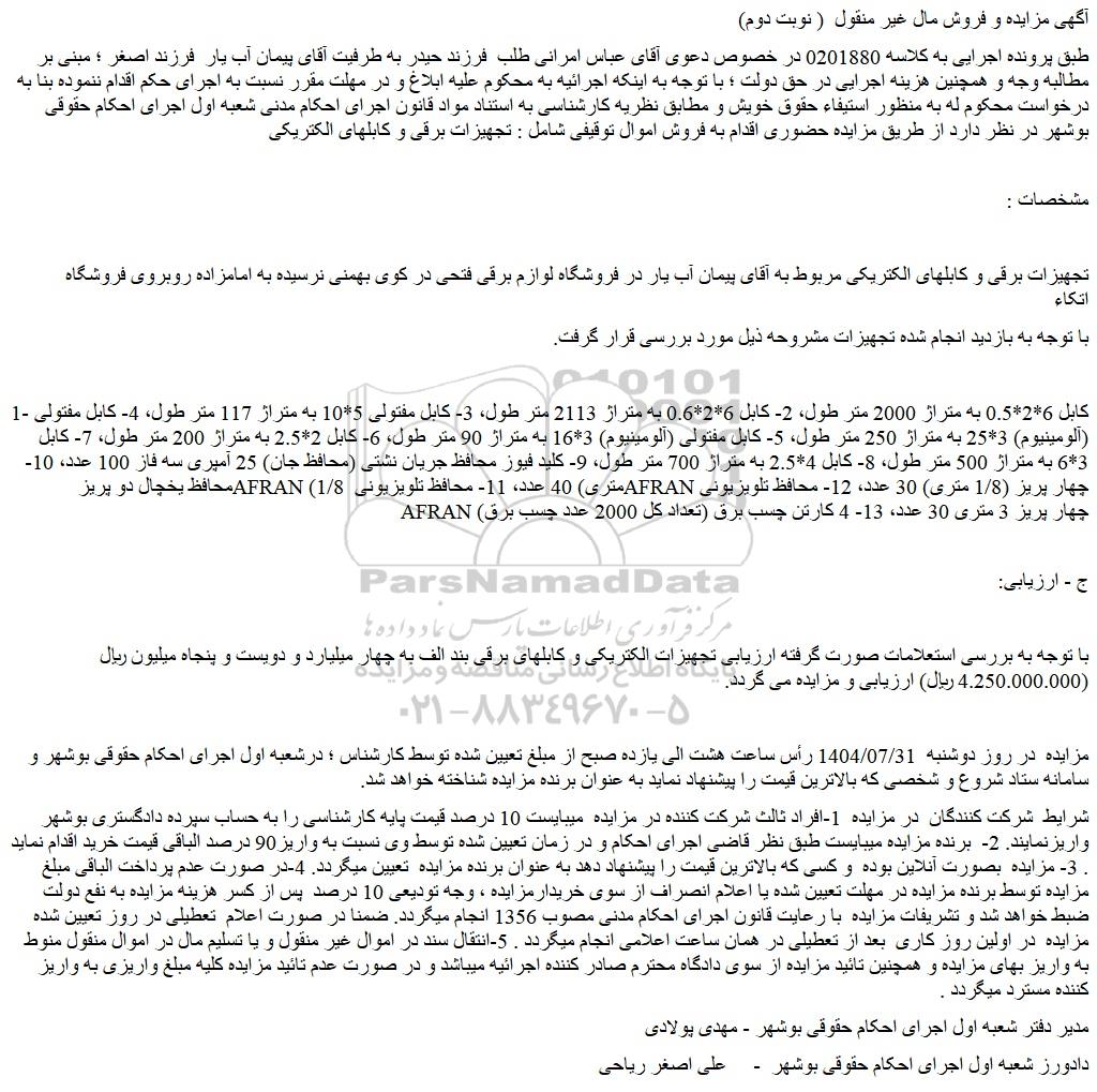 طبق پرونده اجرایی به کلاسه 0201880 در خصوص دعوی آقای عباس امرانی طلب  فرزند حیدر به طرفیت آقای پیمان آب یار  فرزند اصغر ؛ مبنی بر مطالبه وجه و همچنین هزینه اجرایی در حق دولت ؛ با توجه به اینکه اجرائیه به محکوم علیه ابلاغ و در مهلت مقرر نسبت به اجرای حکم اقدام ننموده بنا به درخواست محکوم له به منظور استیفاء حقوق خویش و مطابق نظریه کارشناسی به استناد مواد قانون اجرای احکام مدنی شعبه اول اجرای احکام حقوقی بوشهر در نظر دارد از طریق مزایده حضوری اقدام به فروش اموال توقیفی شامل : تجهیزات برقی و کابلهای الکتریکی