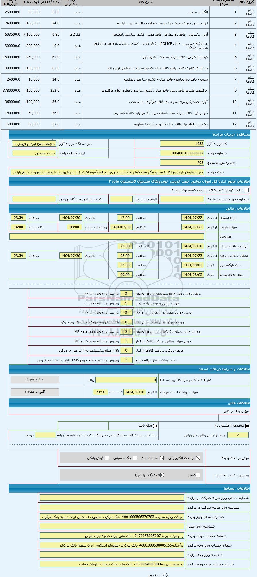 کد مزایده گزار1053نام دستگاه مزایده گزارسازمان جمع آوری و فروش اموال تملیکی