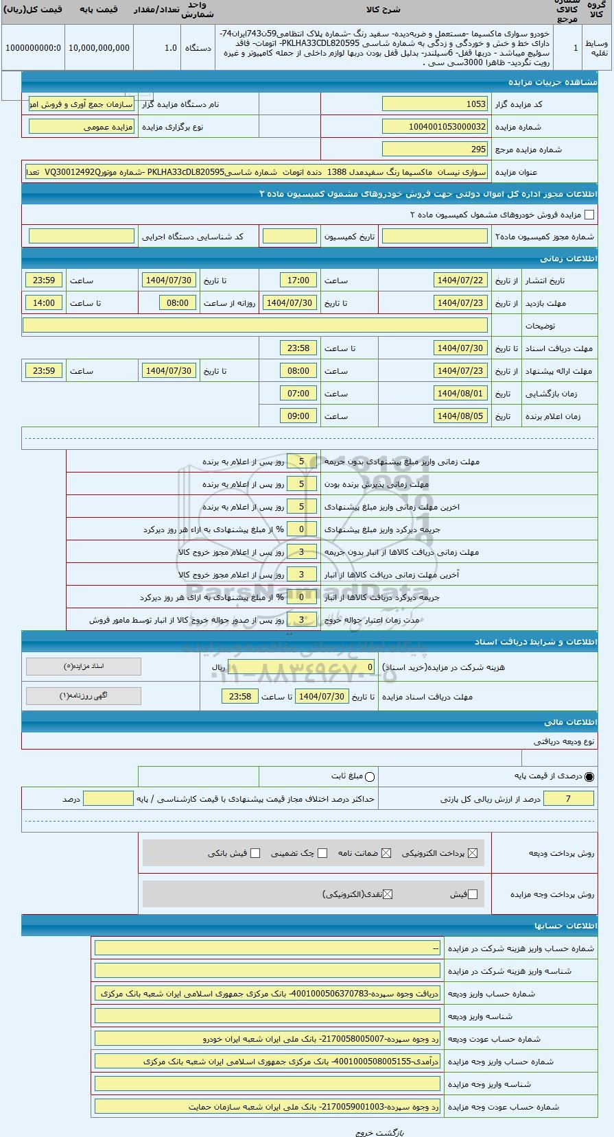 | عنوان مزایده | سواری نیسان ماکسیما رنگ سفیدمدل 1388 دنده اتومات شماره شاسیPKLHA33cDL820595 -شماره موتورVQ30012492Q تعداد سیلندر 6 سوخت بنزین بشماره انتظامی 74 ایران 743ن 59( مبلغ خلافی 2900000 ریال وسایر هزینه های شماره گذاری بعهده خریدار می باشد) | |||