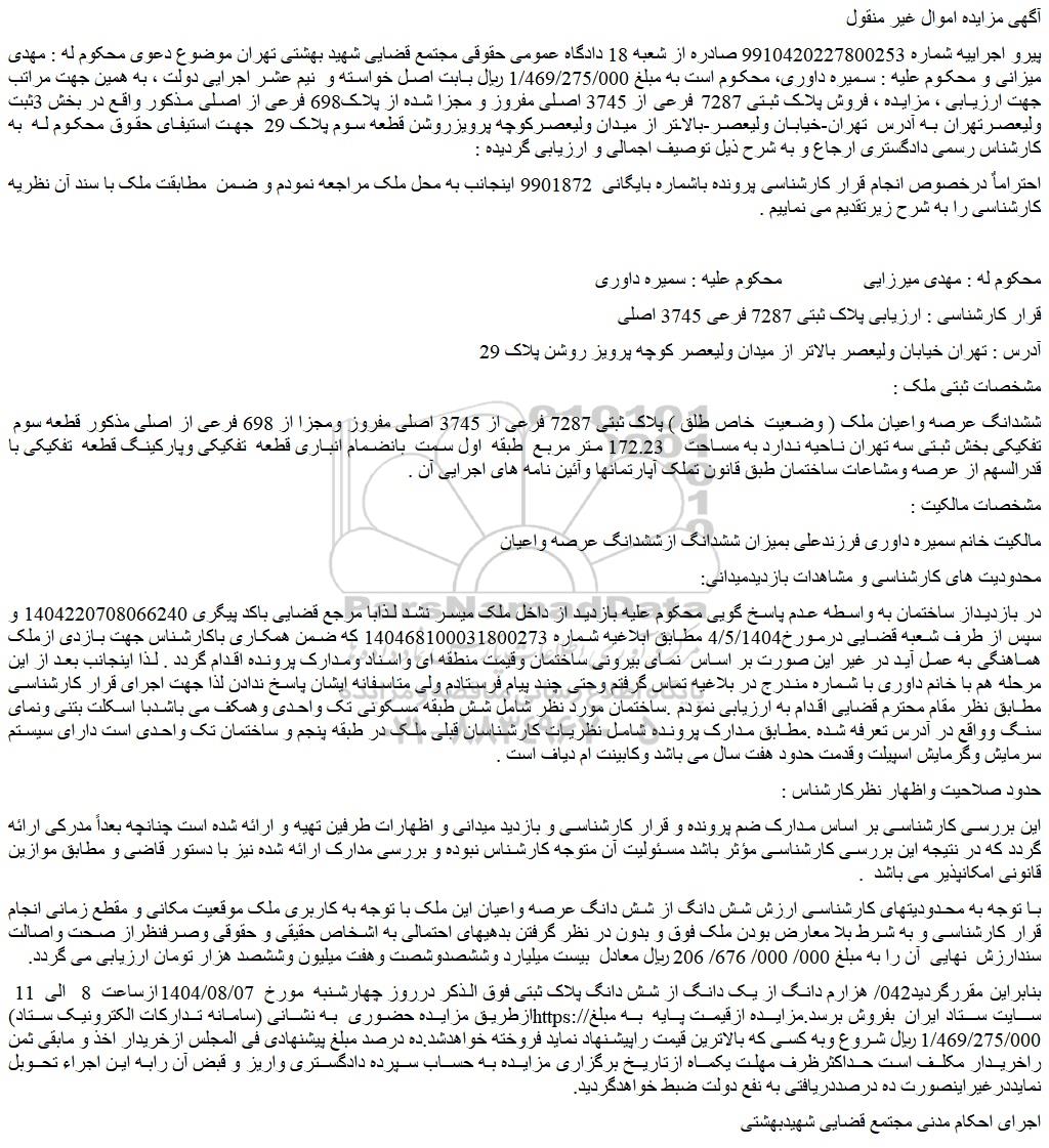 پیرو اجراییه شماره 9910420227800253 صادره از شعبه 18 دادگاه عمومی حقوقی مجتمع قضایی شهید بهشتی تهران موضوع دعوی محکوم له : مهدی میزانی و محکوم علیه : سمیره داوری، محکوم است به مبلغ 1/469/275/000 ریال بابت اصل خواسته و نیم عشر اجرایی دولت ، به همین جهت مراتب جهت ارزیابی ، مزایده ، فروش پلاک ثبتی 7287 فرعی از 3745 اصلی مفروز و مجزا شده از پلاک698 فرعی از اصلی مذکور واقع در بخش 3ثبت ولیعصرتهران به آدرس تهران-خیابان ولیعصر-بالاتر از میدان ولیعصرکوچه پرویزروشن قطعه سوم پلاک 29 جهت استیفای حقوق محکوم له به کارشناس رسمی دادگستری ارجاع و به شرح ذیل توصیف اجمالی و ارزیابی گردیده :