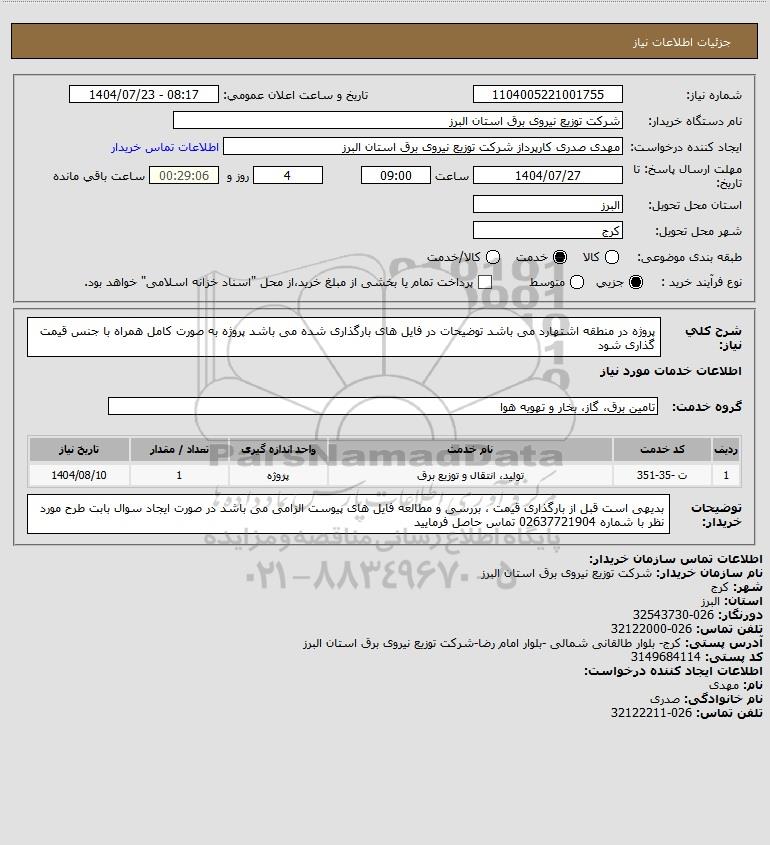 شرح کلی نیاز: پروژه در منطقه اشتهارد می باشد