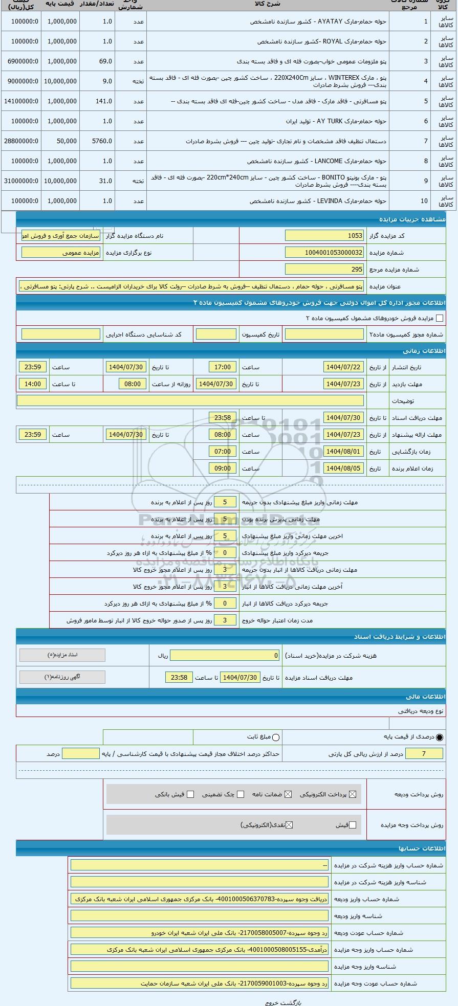 | کد مزایده گزار | 1053 | نام دستگاه مزایده گزار | سازمان جمع آوری و فروش اموال تملیکی | |