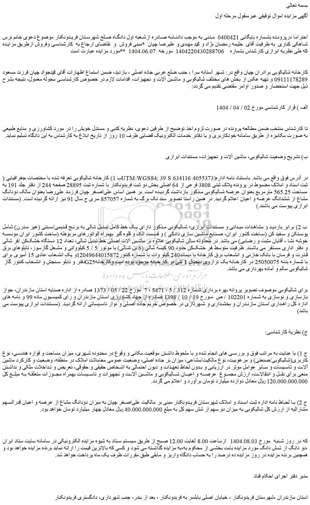 احتراما درپرونده بشماره بایگانی 0400421 مدنی به موجب دادنامه صادره ازشعبه اول دادگاه صلح شهرستان فریدونکنار موضوع دعوی خانم نرس شاهکی کناری به طرفیت آقای حلیمه رمضان نژاد و محمد مهدی و علیرضا چپان *مبنی فروش و تقاضای ارجاع به کارشناسی وفروش ازطریق مزایده که طی نظریه ابرازی کارشناس بشماره 1404220430288706 مورخه 1404.06.07 **مورد مزایده عبارت است